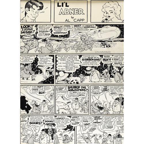 <B>Al Capp Studio - Li'l Abner Sunday Comic Strip Original Art, dated 3-23-52 (United Features Syndicate, 1952).</B></I> Li'l Abner and a rich, exploitative American industrialist fly into lower Slobbovia looking for flying Shmink hides to make Schmink coats, in this <I>Li'l Abner</B></I> Sunday from 1952. And no Slobbovian Sunday is complete without at least one "pazzunt," (peasant), being eaten by a bear (included in this strip)! This desirable strip has an image area of 19" x 26" and the condition is Excellent. <I>From the Estate of Bruce Hamilton</B></I>. <BR><BR><B>Important notice:</B> Heritage usually auctions material at the rate of 200-250 lots per hour. On some occasions eBay Live bid software or the Internet may not be able to keep up with the pace of the auction. We recommend placing a realistic absentee bid now as insurance to avoid disappointment. Occasionally the auctioneer may eliminate or reject an eBay Live bid, and the auctioneer may also reopen a lot after the close of the eBay live bidding (usually because we missed an audience bid), and may reject your bid even if it shows you as the winning bidder. By bidding via eBay Live, you agree that Heritage may award the lot to another bidder at its sole discretion under the circumstances described above or any other reasonable circumstances. Since eBay bids are not shown to us until we open the lot on the floor, we treat those bids just like floor bids. In most cases the floor responds before the eBay bid is presented to us, due to Internet lag time, so for consistency we have made it a policy that floor bids are always considered first over tie eBay live bids. Also please note that all Heritage lots purchased through eBay Live carry a 22.5% Buyer's Premium. Please make sure you read the Terms and Conditions before you bid. This lot is being auctioned in conjunction with a live floor auction by Heritage Auction Galleries. All final auction and invoice information will be supplied by Heritage Auction Galleries, and all other information should be considered preliminary. Lot:41001 <BR><BR><B>Winning Notification and Billing:</B> After the FINAL session in this auction is complete, Heritage will send e-mail and snail mail invoices. This process normally takes several days. All final auction and invoice information will be supplied by Heritage Auction Galleries, and all other information should be considered preliminary. <BR><BR>This auction will be conducted on a live auction floor and over the Internet through eBay Live. If you choose to place an absentee bid, please take a moment to <font color='#0000ff'><u><a href='http://pages.ebay.com/liveauctions/help/before/laabsentee.html'>learn how eBay Live absentee bidding works</a></u></font><font color='#000000'>