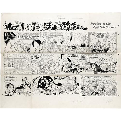 <B>Al Capp Studio - Li'l Abner Sunday Comic Strip Original Art, dated 8-21-66 (News Syndicate, 1966).</B></I> Abstract art finally gets its due from cynical Al Capp in this crazy installment involving "animal sculptures" from Slobbovia that suddenly come to life, leaping and eating all in site until they spy... you guessed it! Although no one named Yokum appears in this instalment, it's still great, well-drawn fun. Former assistant Frank Frazetta's stylish way of drawing females obviously rubbed off on Capp's later assistants -- note the cuties in panel one! Drawn in ink on bristol that has been cut into several segments; joined, they feature an image area of approximately 27" x 18". In Good condition. <BR><BR><B>Important notice:</B> Heritage usually auctions material at the rate of 200-250 lots per hour. On some occasions eBay Live bid software or the Internet may not be able to keep up with the pace of the auction. We recommend placing a realistic absentee bid now as insurance to avoid disappointment. Occasionally the auctioneer may eliminate or reject an eBay Live bid, and the auctioneer may also reopen a lot after the close of the eBay live bidding (usually because we missed an audience bid), and may reject your bid even if it shows you as the winning bidder. By bidding via eBay Live, you agree that Heritage may award the lot to another bidder at its sole discretion under the circumstances described above or any other reasonable circumstances. Since eBay bids are not shown to us until we open the lot on the floor, we treat those bids just like floor bids. In most cases the floor responds before the eBay bid is presented to us, due to Internet lag time, so for consistency we have made it a policy that floor bids are always considered first over tie eBay live bids. Also please note that all Heritage lots purchased through eBay Live carry a 22.5% Buyer's Premium. Please make sure you read the Terms and Conditions before you bid. This lot is being auctioned in conjunction with a live floor auction by Heritage Auction Galleries. All final auction and invoice information will be supplied by Heritage Auction Galleries, and all other information should be considered preliminary. Lot:41001 <BR><BR><B>Winning Notification and Billing:</B> After the FINAL session in this auction is complete, Heritage will send e-mail and snail mail invoices. This process normally takes several days. All final auction and invoice information will be supplied by Heritage Auction Galleries, and all other information should be considered preliminary. <BR><BR>This auction will be conducted on a live auction floor and over the Internet through eBay Live. If you choose to place an absentee bid, please take a moment to <font color='#0000ff'><u><a href='http://pages.ebay.com/liveauctions/help/before/laabsentee.html'>learn how eBay Live absentee bidding works</a></u></font><font color='#000000'>