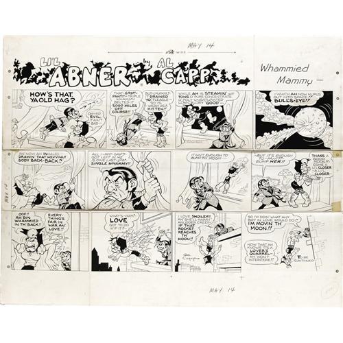 <B>Al Capp Studio - Li'l Abner Sunday Comic Strip Original Art, dated 5-14-67 (News Syndicate, 1967).</B></I> "What's love got to do wif it?" Evil-Eye Fleagle manages to out-whammy Mammy Yokum, in a cosmic tug-of-war involving the moon itself! The prize -- Fleagle's beloved Shoiley! The strip is in ink on bristol that has been cut into several pieces that are currently in three sections; together, they feature an image area of approximately 27" x 18". In Good condition. <BR><BR><B>Important notice:</B> Heritage usually auctions material at the rate of 200-250 lots per hour. On some occasions eBay Live bid software or the Internet may not be able to keep up with the pace of the auction. We recommend placing a realistic absentee bid now as insurance to avoid disappointment. Occasionally the auctioneer may eliminate or reject an eBay Live bid, and the auctioneer may also reopen a lot after the close of the eBay live bidding (usually because we missed an audience bid), and may reject your bid even if it shows you as the winning bidder. By bidding via eBay Live, you agree that Heritage may award the lot to another bidder at its sole discretion under the circumstances described above or any other reasonable circumstances. Since eBay bids are not shown to us until we open the lot on the floor, we treat those bids just like floor bids. In most cases the floor responds before the eBay bid is presented to us, due to Internet lag time, so for consistency we have made it a policy that floor bids are always considered first over tie eBay live bids. Also please note that all Heritage lots purchased through eBay Live carry a 22.5% Buyer's Premium. Please make sure you read the Terms and Conditions before you bid. This lot is being auctioned in conjunction with a live floor auction by Heritage Auction Galleries. All final auction and invoice information will be supplied by Heritage Auction Galleries, and all other information should be considered preliminary. Lot:41001 <BR><BR><B>Winning Notification and Billing:</B> After the FINAL session in this auction is complete, Heritage will send e-mail and snail mail invoices. This process normally takes several days. All final auction and invoice information will be supplied by Heritage Auction Galleries, and all other information should be considered preliminary. <BR><BR>This auction will be conducted on a live auction floor and over the Internet through eBay Live. If you choose to place an absentee bid, please take a moment to <font color='#0000ff'><u><a href='http://pages.ebay.com/liveauctions/help/before/laabsentee.html'>learn how eBay Live absentee bidding works</a></u></font><font color='#000000'>