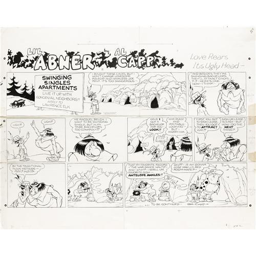 <B>Al Capp Studio - Li'l Abner Sunday Comic Strip Original Art, dated 4-21-74 (New York News, 1974).</B></I> "Love Rears Its Ugly Head" is the subtitle of this installment, and they're not kidding (!) as Lonesome Polecat succumbs to the (yuck!) "charms" of "swinging single" Racquel Belch. Will Hairless Joe lose his "li'l red room-mate"? This Sunday had been cut into sections which have been rejoined by tape, for an overall size of 29" x 23". In Very Good condition. <BR><BR><B>Important notice:</B> Heritage usually auctions material at the rate of 200-250 lots per hour. On some occasions eBay Live bid software or the Internet may not be able to keep up with the pace of the auction. We recommend placing a realistic absentee bid now as insurance to avoid disappointment. Occasionally the auctioneer may eliminate or reject an eBay Live bid, and the auctioneer may also reopen a lot after the close of the eBay live bidding (usually because we missed an audience bid), and may reject your bid even if it shows you as the winning bidder. By bidding via eBay Live, you agree that Heritage may award the lot to another bidder at its sole discretion under the circumstances described above or any other reasonable circumstances. Since eBay bids are not shown to us until we open the lot on the floor, we treat those bids just like floor bids. In most cases the floor responds before the eBay bid is presented to us, due to Internet lag time, so for consistency we have made it a policy that floor bids are always considered first over tie eBay live bids. Also please note that all Heritage lots purchased through eBay Live carry a 22.5% Buyer's Premium. Please make sure you read the Terms and Conditions before you bid. This lot is being auctioned in conjunction with a live floor auction by Heritage Auction Galleries. All final auction and invoice information will be supplied by Heritage Auction Galleries, and all other information should be considered preliminary. Lot:41001 <BR><BR><B>Winning Notification and Billing:</B> After the FINAL session in this auction is complete, Heritage will send e-mail and snail mail invoices. This process normally takes several days. All final auction and invoice information will be supplied by Heritage Auction Galleries, and all other information should be considered preliminary. <BR><BR>This auction will be conducted on a live auction floor and over the Internet through eBay Live. If you choose to place an absentee bid, please take a moment to <font color='#0000ff'><u><a href='http://pages.ebay.com/liveauctions/help/before/laabsentee.html'>learn how eBay Live absentee bidding works</a></u></font><font color='#000000'>