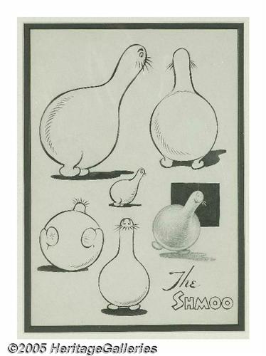<B>Al Capp Studio - The Shmoo Model Sheet Original Art (undated).</B></I> When the Shmoo first appeared in <I>Li'l Abner</B></I> in August 1948, they were a seeming miracle. The adorable creature laid eggs, gave milk and died of sheer ecstasy when looked at with hunger. The Shmoo loved to be eaten by humans and tasted like any food desired. The character's remarkable success catapulted Al Capp to an all-new level of wealth and fame. Licensed Shmoo merchandise was a huge phenomenon in the late 40s and early 50s, spawning a wide variety of dolls, toys, and more. Here is a model sheet from the Al Capp Studio that shows the lovable little character in different poses. Drawn in pen and ink and pencil, the image area measures 8" x 11," and is in Excellent condition. The Shmoo continues to garner attention and prove collectible more than a half century after its debut.
