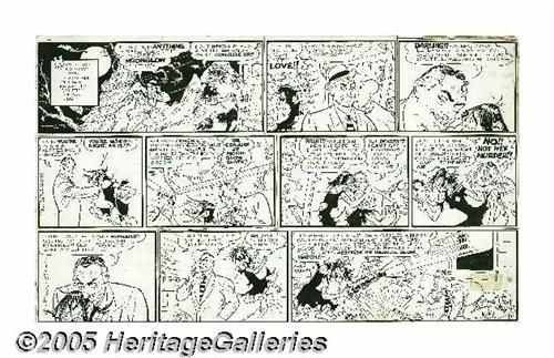 <B>Al Capp Studio with Frank Frazetta - Li'l Abner Sunday Comic Strip Original Art, dated 2-13-55 (United Features Syndicate, 1955).</B></I> Hernando Slideaway will do almost anything to get his hands on the coveted fashion secret of how to make Moon Glow cloth -- even court Nightmare Alice, the gnarly witchy-woman! Hernando Slideaway's moniker is no doubt a play on the title of the catchy Richard Adler-Jerry Ross song, "Hernando's Hideaway," from the movie, "The Pajama Game." As comics historian Richard Marschall wrote, "Al Capp logically belongs within the group of American humorists populated by the great local colorists and dialecticians. Capp's milieu and methods put him squarely and prominently in the bloodline of Sut Lovingood, Artemus Ward, Petroleum V. Nasby, Mark Twain, Ring Lardner, and following Capp himself, the comics' own Walt Kelly, whose <I>Pogo</B></I> further continued the precious tradition." The image area of this beautifully drawn Sunday measures approximately 27.5" x 16". Each of the panels were cut apart and mounted to a large piece of support paper. The paper shows signs of aging, edge wear, and a caption box has slipped off of the final panel; otherwise the strip is in Very Good condition.
