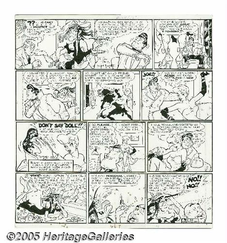 <B>Al Capp Studio with Frank Frazetta - Li'l Abner Sunday Comic Strip Original Art, dated 5-29-55 (United Features Syndicate, 1955).</B></I> Robert Midjutt turns to his "old friend" Joe to help console him through his rough times with Nightmare Alice, in this splendid Sunday from 1955. Frank Frazetta ghosted <I>Li'l Abner</B></I> from 1954 to 1962, injecting a bit of his personal style into the strip, which is especially apparent in his renditions of Capp's lovely ladies. You can sense the Frazetta touch in Joe's luscious structure, and in the rugged line work of Alice. Frazetta seldom signed his work with Capp, but this unique strip contains his signature in the first frame. The image area measures 21" x 22". The art consists of individual panels which have been taped at the back. There is some scattered staining, otherwise the work is in Very Good condition.