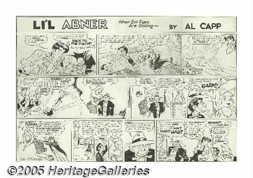 <B>Al Capp Studio with Frank Frazetta - Li'l Abner Sunday Comic Strip Original Art, dated 7-29-56 (United Features Syndicate, 1956).</B></I> Mammy Yokum's vision of Evil-eye Fleegle's mating dance spotlights plenty of gorgeous "good girl" hijinx. Panels three, four, and six are chock-full of eye-popping "cheesecake," and this sizzling Sunday displays the considerable contributions of Al Capp assistant Frank Frazetta. The image area of this Sunday measures approximately 27.5" x 18". Each of the three panel tiers, and several of the individual panels were cut apart and later rejoined; the top tier shows signs of paper aging; otherwise the strip is in Very Good condition.