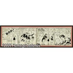 <B>Al Capp Studios - Li'l Abner Daily Comic Strip Original Art, dated 4-29-37 (United Feature Syndicate, 1937).</B></I> Mammy Yokum smacks Abner around somethin' fierce, which finally gets his brain back to normal -- but will he still want to marry Daisy Mae? (Well, DUH -- who wouldn't?!?) Al Capp and Co. bring their usual stunning linework and the ever-distinctive <I>patois</B></I> of Dogpatch to bear on this fabulous daily, with great shots of the cutest couple in comicdom. The artwork was cut between the second and third panel, and shows some overall aging, but is in Very Good condition overall, and has been tastefully matted and framed. The image area measures 22" x 6". If you need to add some <I>Abner</B></I> to your portfolio, this just may be the one.