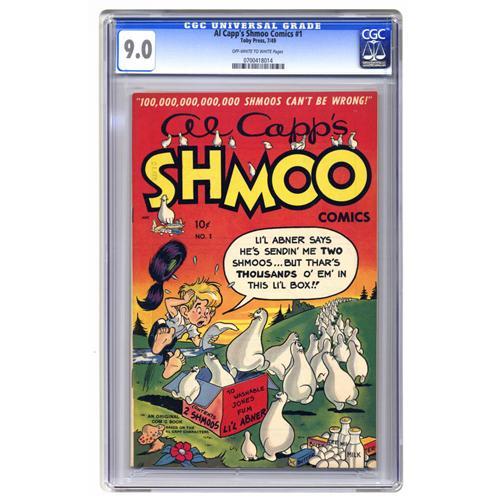 <B>Al Capp's Shmoo Comics #1 (Toby Publishing, 1949) CGC VF/NM 9.0 Off-white to white pages.</B></I> Features the character from Li'l Abner. Overstreet 2006 VF/NM 9.0 value = $338; NM- 9.2 value = $450. CGC census 3/06: 2 in 9.0, 2 higher.
