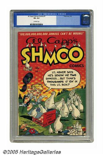 <B>Al Capp's Shmoo Comics #1 (Toby Publishing, 1949) CGC VF+ 8.5 Off-white pages.</B></I> Do you Shmoo? Millions do! At least they did back in the day, when Al Capp's crazy creation from <I>Li'l Abner</B></I> swept the nation. Shmoo merchandise was everywhere, depicting the lovable little blob-like creatures who lived to make humans happy. The lucky high bidder on this lot will certainly be happy with this choice copy! Overstreet 2005 VF 8.0 value = $233; VF/NM 9.0 value = $342. CGC census 7/05: 1 in 8.5, 3 higher.