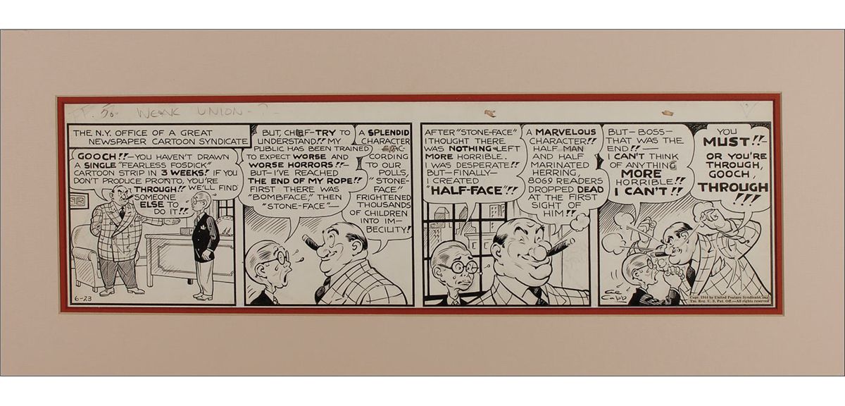 Original hand-inked four panel comic strip, 22.5 x 6.5, featuring the boss of a NY newspaper cartoon syndicate berating a cartoonist, pressing him to create a character more horrible than his last, which was “half man and half marinated herring, 8069 reads dropped dead at the first sight of him!,” signed on the last panel in ink, “Al Capp.” Double-matted to an overall size of 27 x 11.25. The expected pencil notations, a few trivial spots of soiling, and a small newspaper clipping affixed to the bottom right corner of the last panel, otherwise fine condition. Oversized.