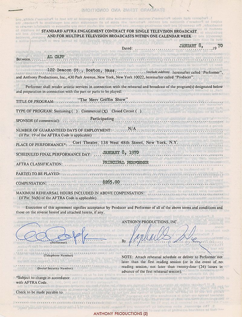 DS, one page, 8.5 x 11, January 8, 1970. Standard AFTRA contract in which Capp agrees to appear on The Merv Griffin Show on the same day in exchange for $265. Signed at the conclusion in ballpoint by Capp. A standard AFTRA rider is stapled to the main document at the top. In fine condition, with expected document wear.
