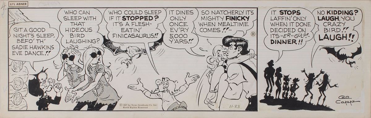 Original hand-inked two panel comic strip, 19.75 x 6.25, showing a scene featuring his famous Li'l Abner hillbilly characters encountering a laughing prehistoric bird called the Finicasaurus. The final panel shows Li’l Abner Yokum asserting that “It stops laffin’ only when it done decided on its–er–gulp!–dinner!!” Comic is signed in the final panel in black ink, “Al Capp.” The first panel is ink dated “11-23,” and bears an affixed 1967 copyright notice. In fine condition.