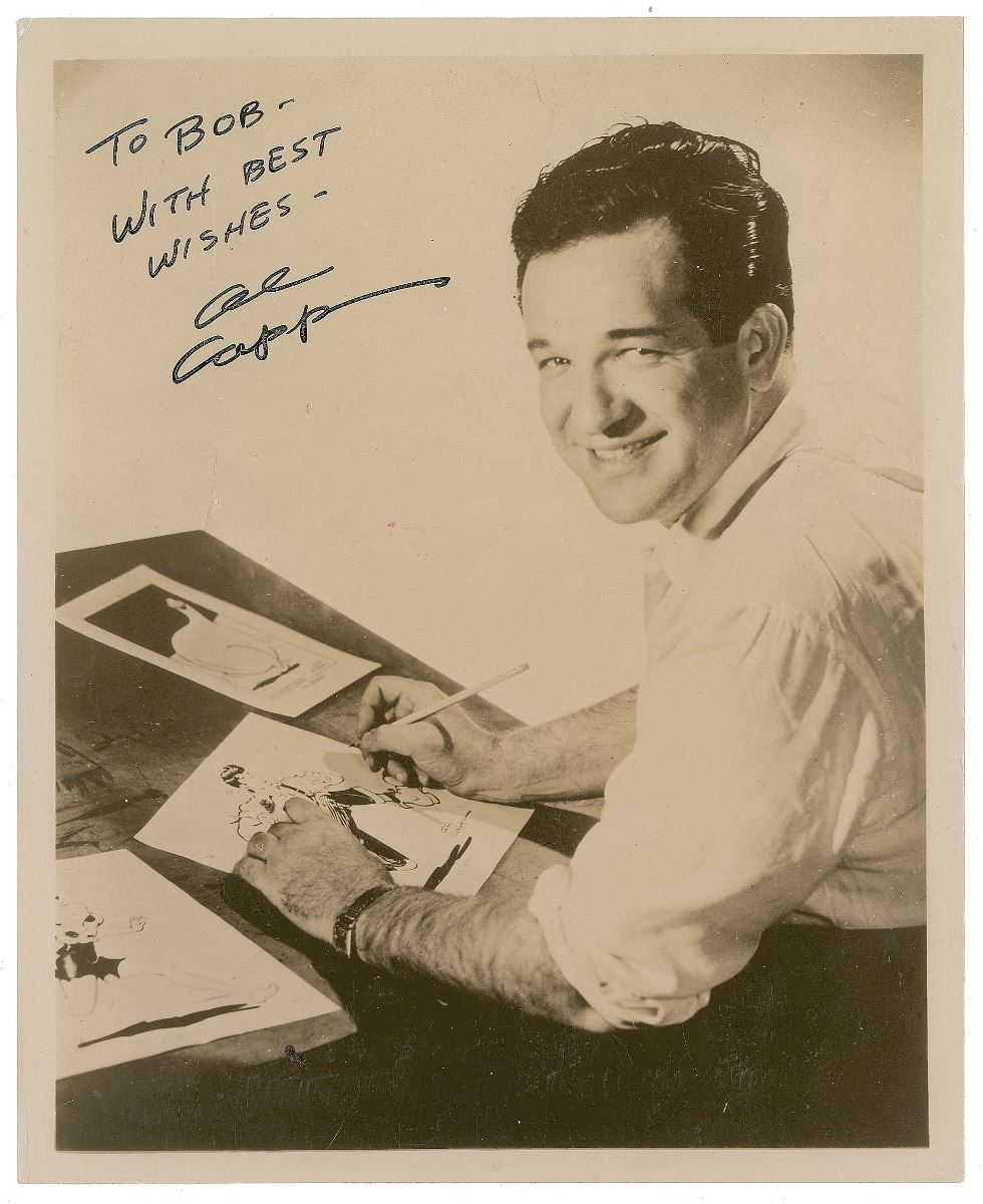 Vintage 8 x 10 photo of Capp seated at his sketching table, signed and inscribed in fountain pen, “To Bob—with best wishes—Al Capp.” In very good to fine condition, with scattered overall surface creases and impressions.