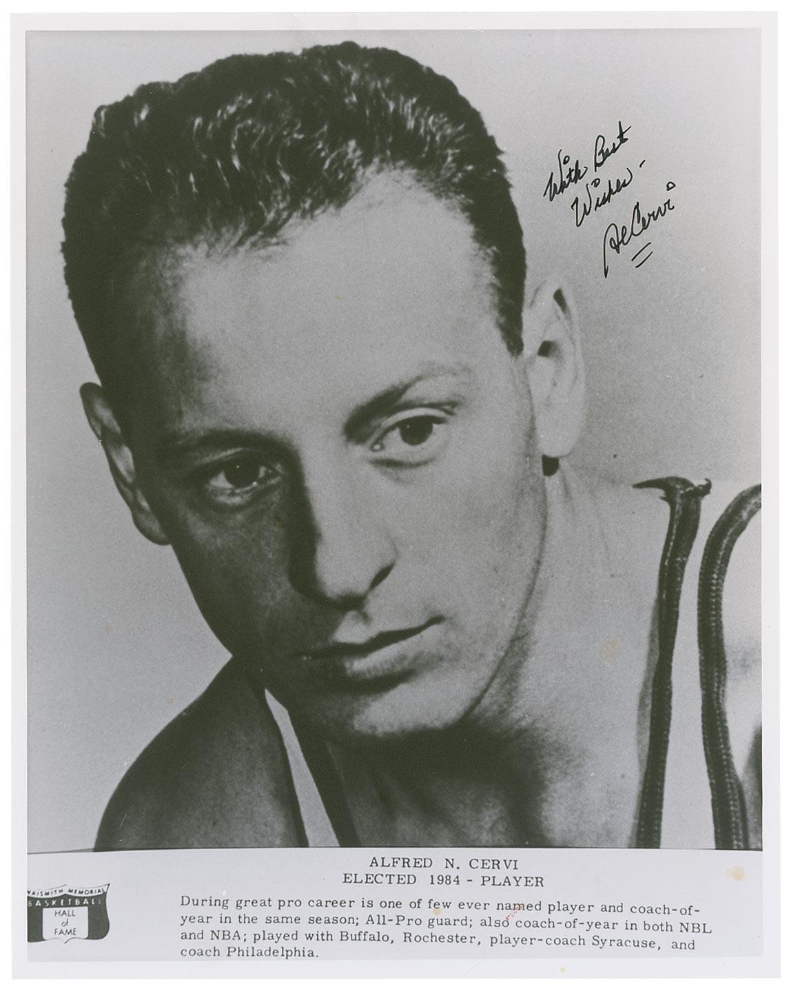 Basketball Hall of Famer (1917–2009), known for his scrappy, hustling style of play, Cervi was a premier player of his time who never played college basketball. Satin-finish 8 x 10 photo of his Hall of Fame enshrinement photo, signed in black felt tip. In fine condition.