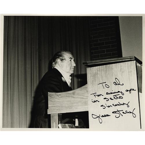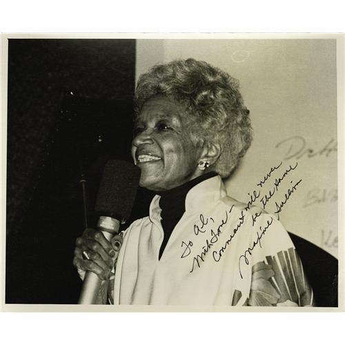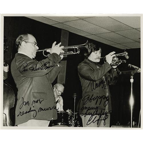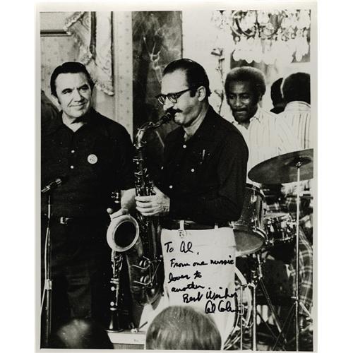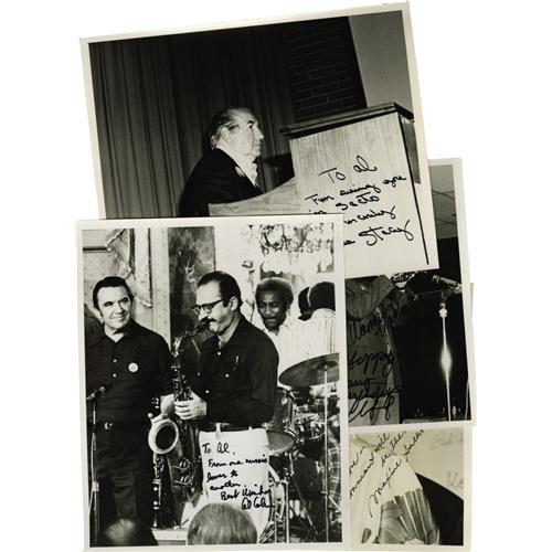 <B>Al Cohn, Jess Stacy, Maxine Sullivan, Pee Wee Erwin, Cliff Leeman, and Warren Vache Jr., Autographed Al White "Jazz Party" Silver Prints, Group of 4 (1974-1995).</B></I> <BR>Johnny Mince (clarinet and saxophone), Al Cohn (saxophone), and Oliver Jackson (drums, page 36) -- Johnny Mince, another veteran of the big bands, watches Al Cohn approvingly at the 1974 Colorado Springs jazz party. <BR>Jess Stacy (piano, page 192) -- Jess Stacy played on riverboats and then in Chicago before joining Benny Goodman's band. He also played with Bob Crosby's band and the Bob Cats. <BR>Maxine Sullivan (vocalist, page 196) -- Maxine Sullivan sang the blues with Louis Armstrong at the Cotton Club. <BR>George "Pee Wee" Erwin (trumpet), Cliff Leeman (drums), and Warren Vache Jr. (coronet, page 208) -- Warren Vache. Jr. had an incomparable coronet teacher, Pee Wee Erwin, and the two of them belt out a duet in Jackson, Mississippi, in 1978. <BR>Each 8" x 10" silver print is in Excellent condition. <I>From the Al White Jazz autograph archive.</B></I>