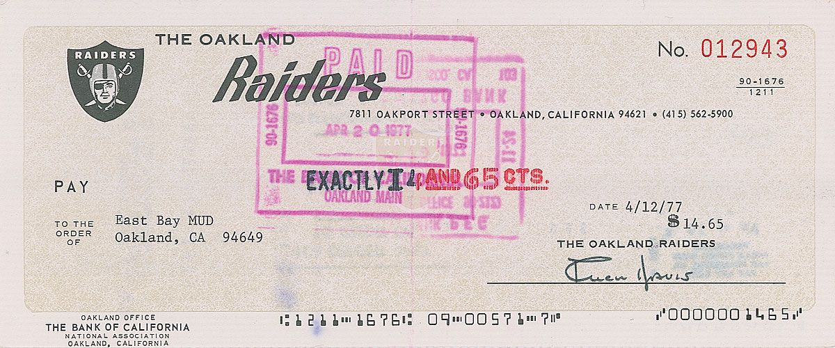 Scarce Oakland Raiders business check, 8.5 x 3.5, filled out in type and signed by Davis, “Allen Davis,” payable to East Bay MUD for $14.65, April 12, 1977. In fine condition, with a central vertical fold and expected bank stamps (not affecting the signature).