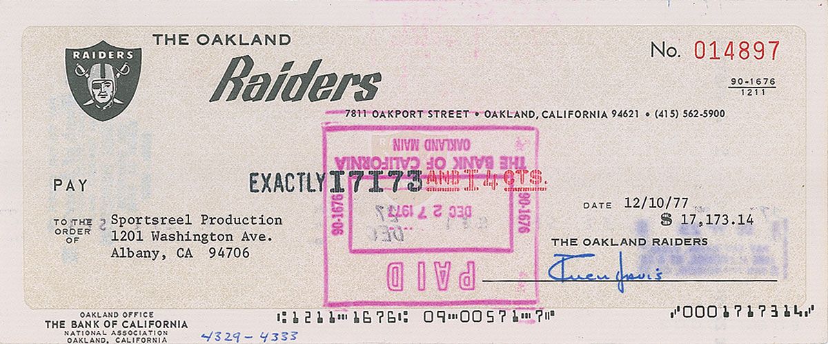Football Hall of Famer who owned the Oakland Raiders (1929–2011). Oakland Raiders business check, 8.5 x 3.5, filled out in type and signed by Davis, “Allen Davis,” payable to Sportsreel Production for $17,173.14, December 10, 1977. In fine condition, with expected bank stamps (not affecting the signature).
