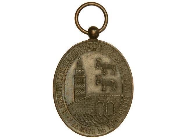 Al Ejército Libertador y Defensor de la invicta Bilbao. - 2 Mayo 1874. - Br. 40 x 33 mm. Variante subversiva. Asnos en vez de lobos. Con anilla. (Leves golpecitos). PG-747a. EBC. - -
