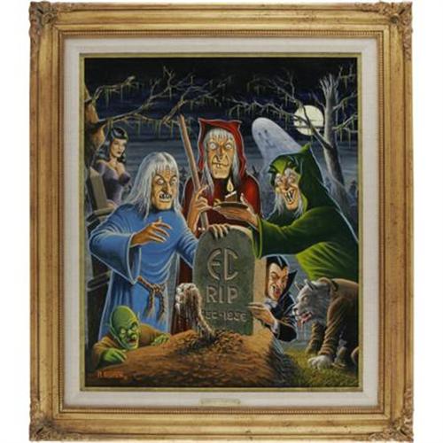 <B>Al Feldstein - Overstreet Comic Book Price Guide #30 Cover Featuring EC Horror Hosts Original Art (2000).</B></I> Good lord...choke...it's the ghosts of horror comics past as those beloved EC horror hosts, the Vault Keeper, the Old Witch, the Crypt Keeper, and Drusilla return for a spine-tingling scene to celebrate the Golden Anniversary of EC's "New Trend" comics. Something's clawing its way out of a grave marked with the tombstone "EC RIP 1950-1956" -- hoo-<I>hah</B></I>, EC lives again! This painting has an image area of 20" x 24", and the art is in Excellent condition. <BR><BR><b>Shipping:</b> Framed - without Glass, Medium (<a target="_blank" href="http://www.heritageauctions.com/common/shipping.php">view shipping information</a>)