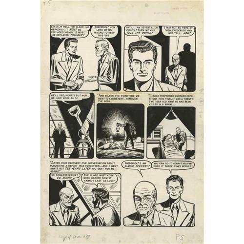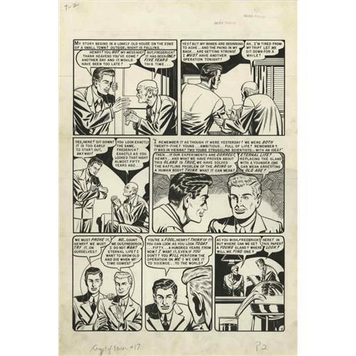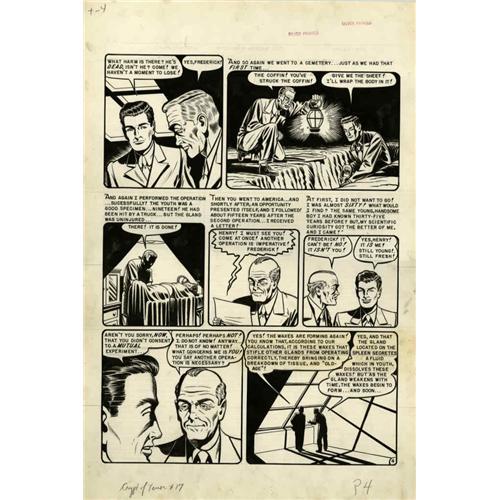 <B>Al Feldstein - The Crypt of Terror #17, Complete 8-page Story "Death Must Come" Original Art (EC, 1950).</B></I> Hoo-hah! -- here's the lead-off story for that new trend in magazines -- the illustrated suspenstories that EC dared us to read! <B>Crypt of Terror</B></I> was the first of the EC New Trend horror titles to hit the stands, and this Al Feldstein opener blazed a trail for the others to follow. Feldstein recalled the evolution of the Crypt Keeper in Fred Von Bernewitz and Grant Geissman's book, <B>Tales of Terror</B></I>: "I did the <B>Crypt of Terror</B></I> with the Crypt Keeper. I didn't know exactly what I was doing with this guy. I just wanted to have him scary and eerie, so I had his hair hanging all over his face like Al Capp's Shmoo (Feldstein may have meant the Bald Iggle), and that was the beginning. Bill (Gaines) was very excited because now he was into something that he could lay his hands on." The image area of each page measures 13" x 18", and the art is in Excellent condition. Don't miss out on your chance to bid one of the earliest EC horror yarns -- an Al Feldstein chiller that helped change the course of comics forever!