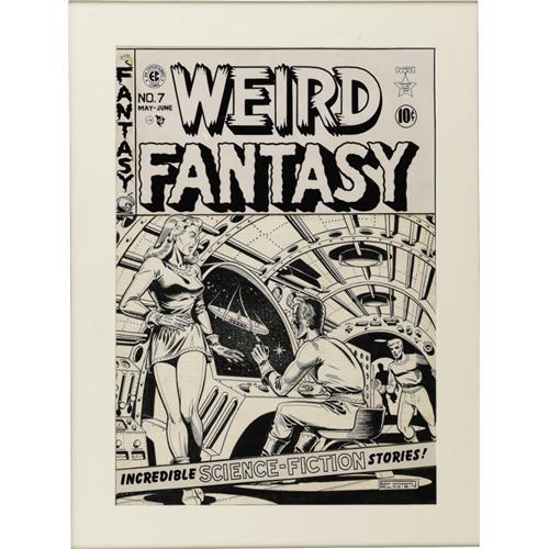 <B>Al Feldstein - Weird Fantasy #7 Cover Original Art (EC, 1951).</B></I> This piece incorporates all of the elements that a collector looks for in a science fiction cover. It has spacemen, rocket ships in outer space, and a voluptuous space girl striking a pose for all her admiring fans. The piece certainly qualifies as a "headlight" cover, and is arguably the best example of that genre that Feldstein ever produced. This stellar cover has an image area of 13.5" x 19.5", and the art is in Excellent condition.