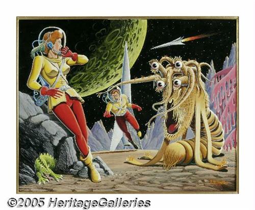 <B>Al Feldstein - "Weird Science-Fantasy #1 Revisited" Painting Original Art (2002).</B></I> Al Feldstein was a key architect in the success of EC comics. Feldstein was a rare triple-threat -- he served as the editor, writer, and sometimes-artist for the EC science-fiction titles. His stylish science-fiction scenes were influenced by the precise, clean-edged astronomical paintings of Chesley Bonestell, but Feldstein's covers often boasted his own added heavenly body -- one sporting the famed Feldstein "headlights" -- <I>hey now!</B></I> This superb painting recalls many of the sensational hallmarks that make Feldstein covers so special. The painting measures 30" x 24", and is in Excellent condition. This masterpiece would look stellar in any EC aficionado's' collection!
