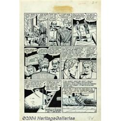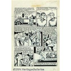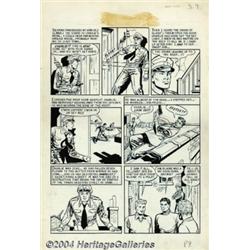 Al Feldstein and Johnny Craig - Original Art for Crime Patrol #13, Complete 9-page Story, "I Fight Crime" (EC, 1949). Al Feldstein and Johnny Craig have collaborated on this story, using their team ghost-name of "F. C. Aljohn." Al Feldstein commented, "...I wish that I could draw like Johnny Craig. He was slick and finished and was my idol of where I'd like to go with my artwork.... The Love and Crime books had some stories that were done by F.C. Aljohn, which was Feldstein, Craig, Al, and John..." Al Feldstein wrote and penciled the story, and Johnny Craig inked it. As a bonus to art fans, there are some lovely Johnny Craig blue-penciled drawings on the backs of pages 3, 4, and 5. The overall art paper measures 15" x 22", with an image area of 13" x 18". Some of the blue under-penciling shows from beneath the inks. The art is in excellent condition. The Crime Patrol title stats at the top of each page have fallen off, leaving a glue stain. Panel three of page six has a word balloon correction, that has also slipped off. An early crime story by EC's two editor-writer-artist phenoms! Important notice: Heritage usually auctions material at the rate of 200-250 lots per hour. On some occasions eBay Live bid software or the Internet may not be able to keep up with the pace of the auction. We recommend placing a realistic absentee bid now as insurance to avoid disappointment. Occasionally the auctioneer may eliminate or reject an eBay Live bid, and the auctioneer may also reopen a lot after the close of the eBay live bidding (usually because we missed an audience bid), and may reject your bid even if it shows you as the winning bidder. By bidding via eBay Live, you agree that Heritage may award the lot to another bidder at its sole discretion under the circumstances described above or any other reasonable circumstances. Since eBay bids are not shown to us until we open the lot on the floor, we treat those bids just like floor bids. In most cases the floor responds before the eBay bid is presented to us, due to Internet lag time, so for consistency we have made it a policy that floor bids are always considered first over tie eBay live bids. Also please note that all Heritage lots purchased through eBay Live carry a 20% Buyer's Premium. Please make sure you read the Terms and Conditions before you bid.