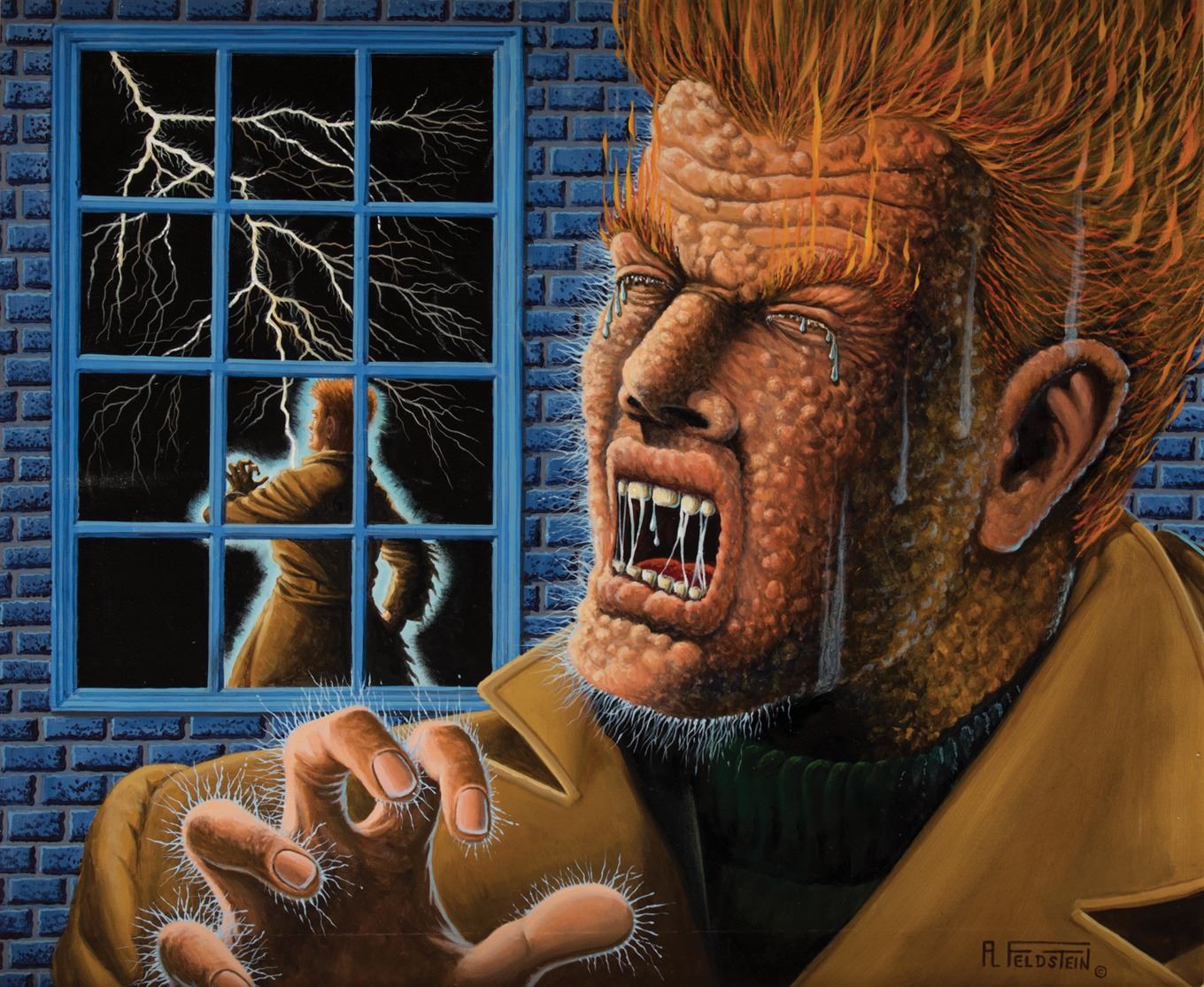 33. Al Feldstein original cover recreation artwork for Shock SuspenStories #7. (EC, 1953/2005) Accomplished in oils on 19.5 x 23.5 in. stretched canvas visible through frame. In the 1950s, comic book artist Al Feldstein drew some of the most shocking, heart-stopping covers for EC's horror and Sci-Fi titles. Then, in the early 2000s, he created a select few oil paintings revisiting some of his most iconic cover works. This incredible piece is one of them. The image depicts a man literally frying alive as a bolt of lightning strikes him during a thunderstorm. Skin bubbles off his bones as his blood boils from the jolting electricity coursing through his body. Stunning detail in this timeless horror masterpiece! Signed by the artist. In very good condition. $6,000 - $8,000