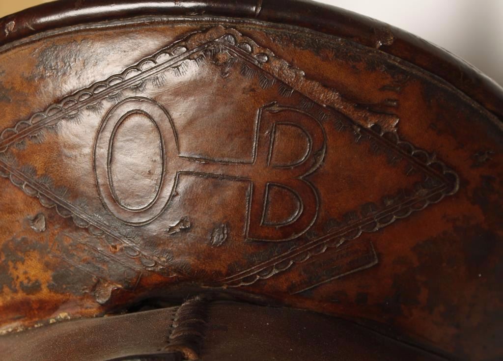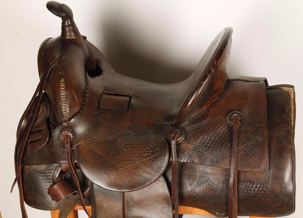 Smooth brown leather with diamond pattern that is accented with a basketweave design. Square skirt, maker marked, also marked '110'. Shows age, overall fair condition.