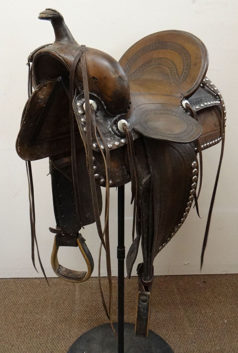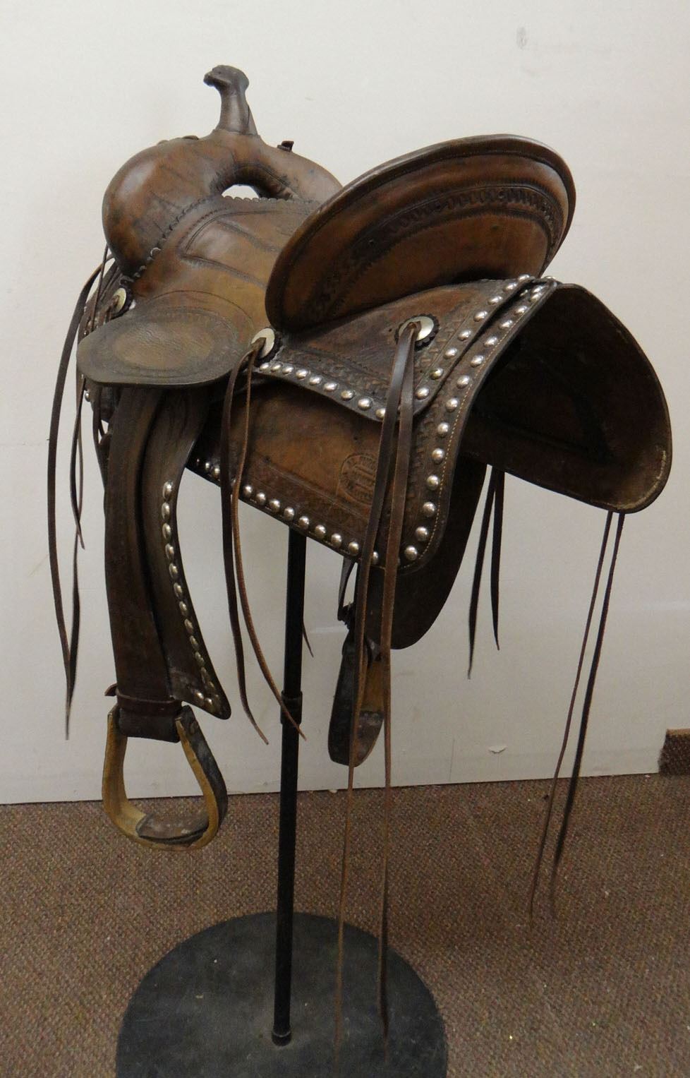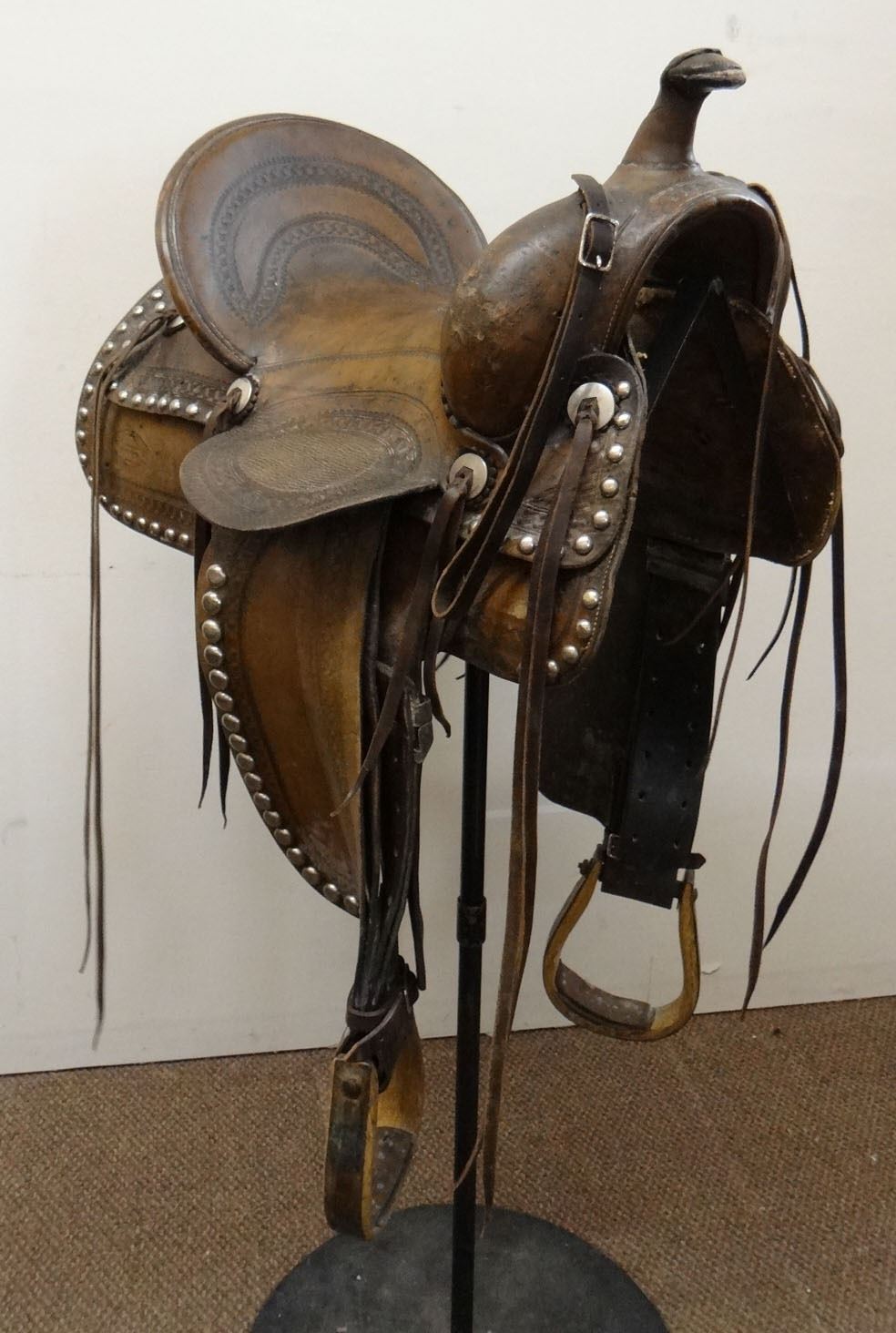 Al Furstnow 15" fancy border studded saddle, some restoration, sq. skirts, dble rigged