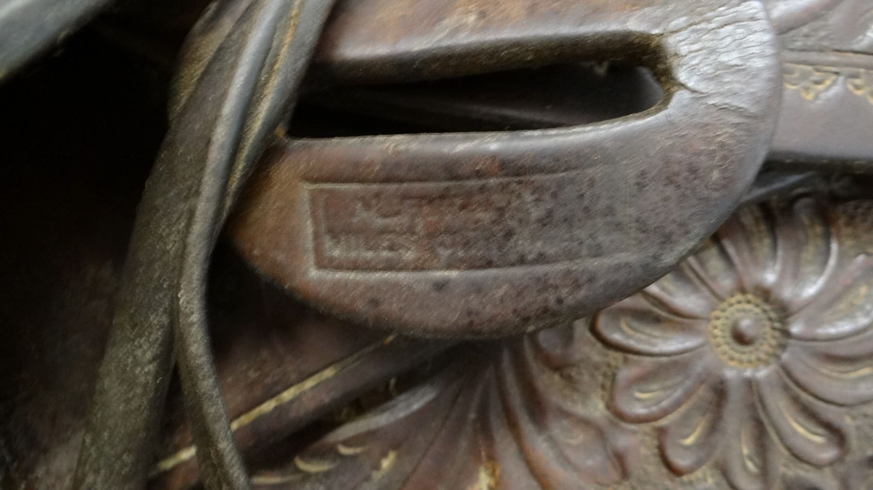 Al Furstnow #156 saddle, 13 1/2", flower tooled, dble rigged, brand on back of cantle: S hanging T, number on cantle 336 47.