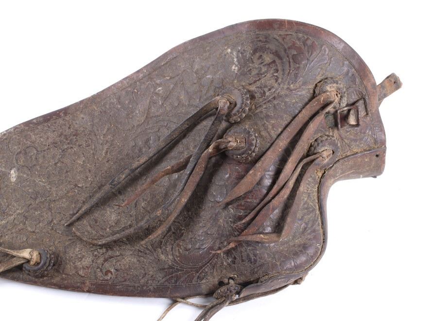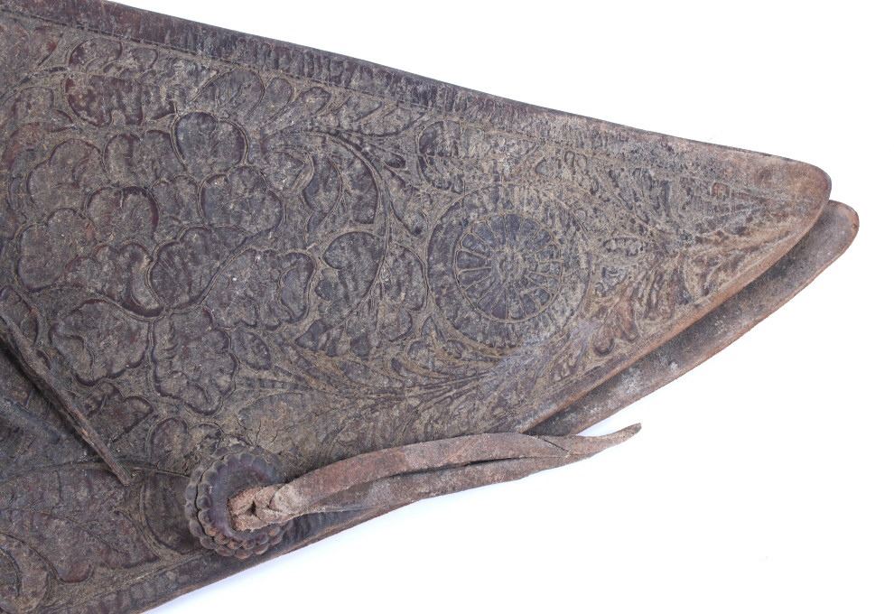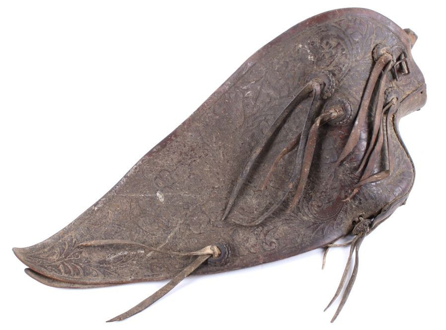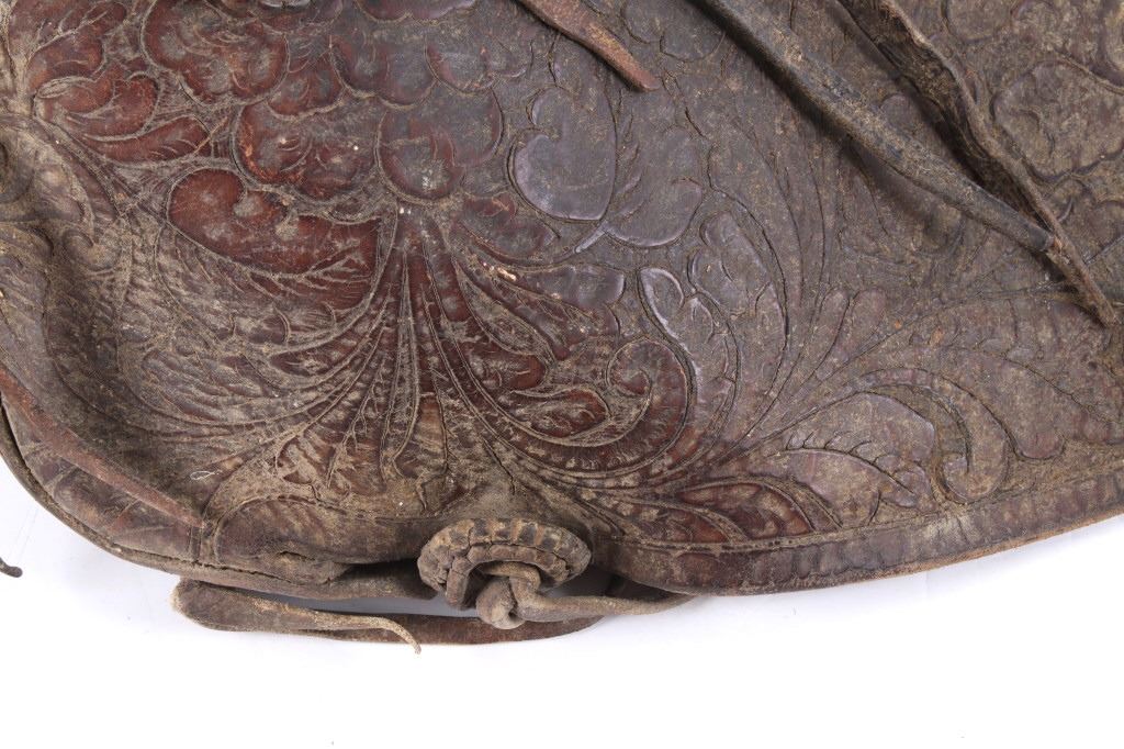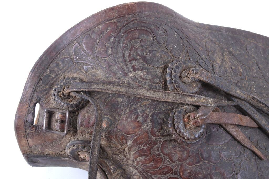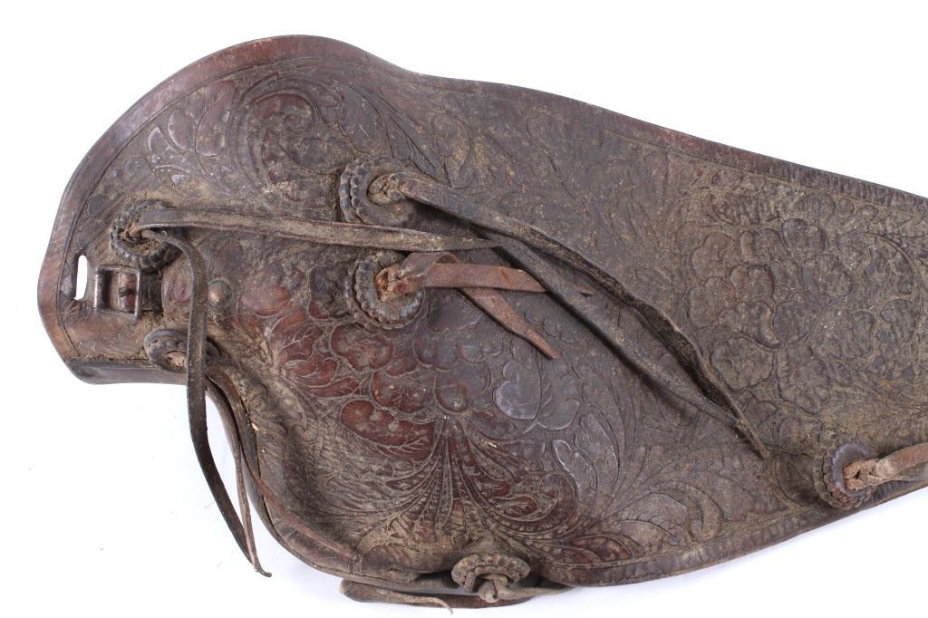For your consideration is a pair of tooled leather western Tapaderos attributed to Al Furstnow. These Tapaderos covers are expertly tooled with a beautiful floral western design. These Tapaderos are unmarked but are extremely similar in style to that of predominant maker Al Furstnow. A tapadero prevents the rider's boot from slipping through and also prevents brush encountered while working cattle on the open range from poking through the stirrup, injuring or impeding the horse or rider. The leather is in good condition but should be cleaned and oiled. The Tapaderos measure approximately 26” x 8” x 11 ¾”.