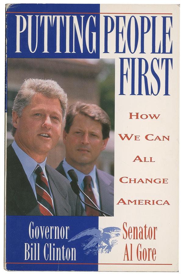 Two books: softcover copy of Putting People First by Bill Clinton and Al Gore, signed in black felt tip on the half-title page “With best wishes, Al Gore”; and a hardcover copy of Al Gore, Jr.: His Life and Career by Hank Hillin signed and inscribed in black felt tip on the first free end page, “For Ross Bilken, with best wishes, Al Gore.” Scattered wear to both books and a few small tears to the dustjackets, otherwise overall fine condition.