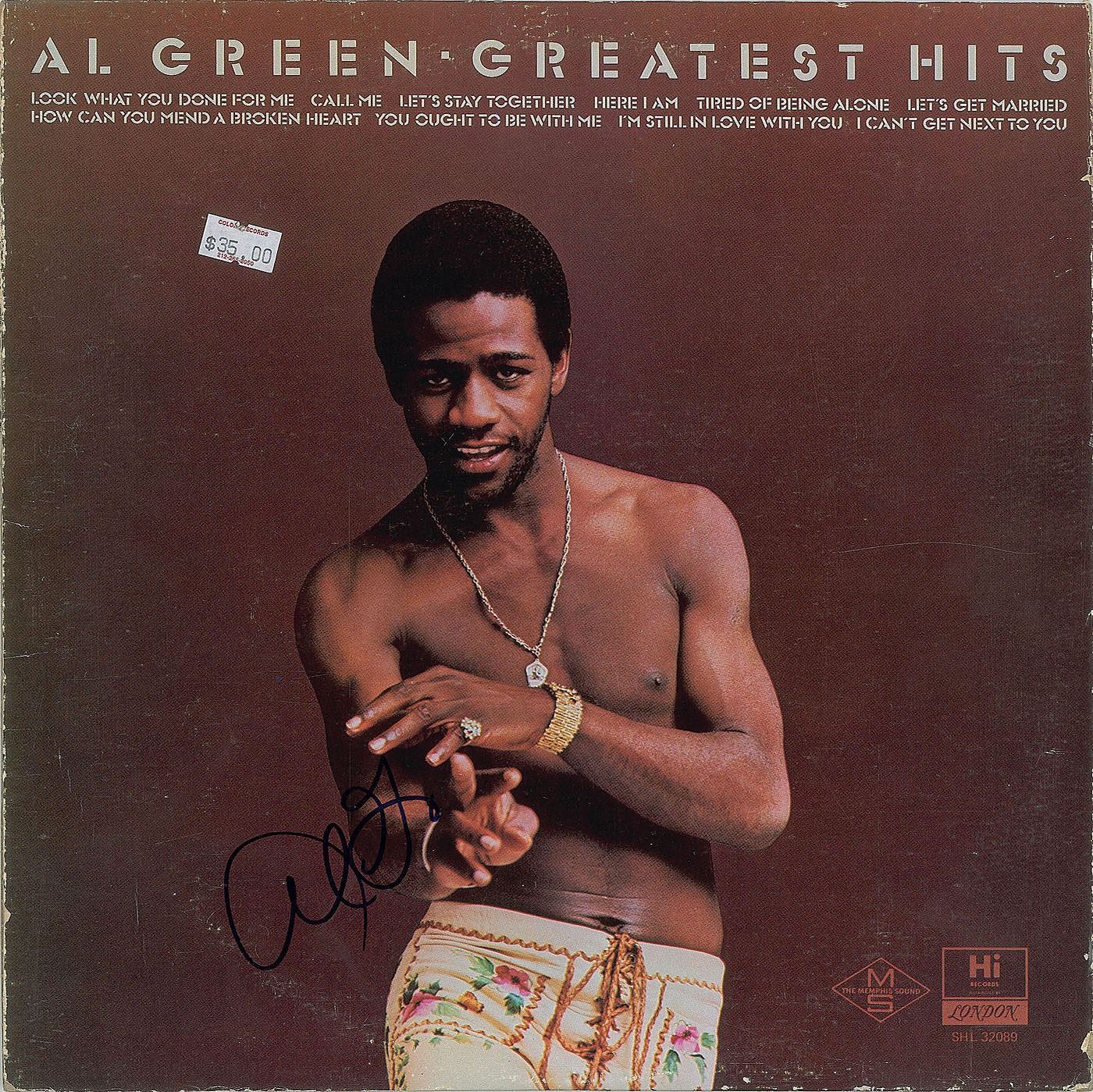 Two albums signed on the front cover in blue felt tip by Al Green: Greatest Hits and I'm Still in Love with You. In overall fine condition, with edge wear and splits and affixed price stickers. The records are included.