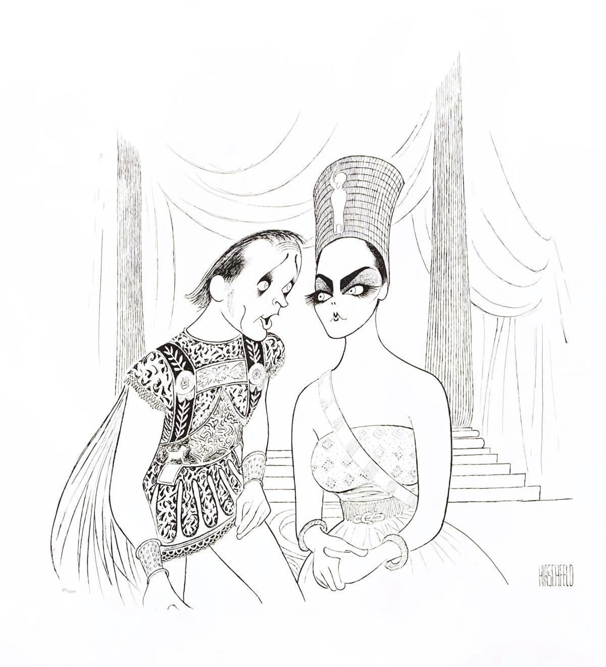 Artist: Al Hirschfeld. Medium: Original Lithograph on Paper. Title: Anthony & Cleopatra. Size (Unframed): 18" x 22". Certificate of Authenticity: Is Included. Additional: Plate Signed and numbered.