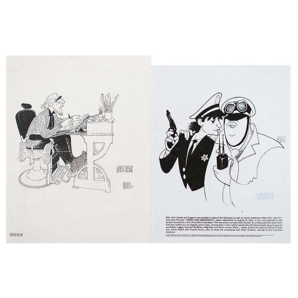 Two items: a glossy 8 x 10 photo of his caricature of John Candy and Eugene Levy in Armed and Dangerous, signed in blue ballpoint, "Hirschfeld"; and an 8.5 x 11 paperstock print of a self-portrait caricature, signed in black ballpoint, "Hirschfeld." In fine condition, with three horizontal mailing folds to the paperstock print.