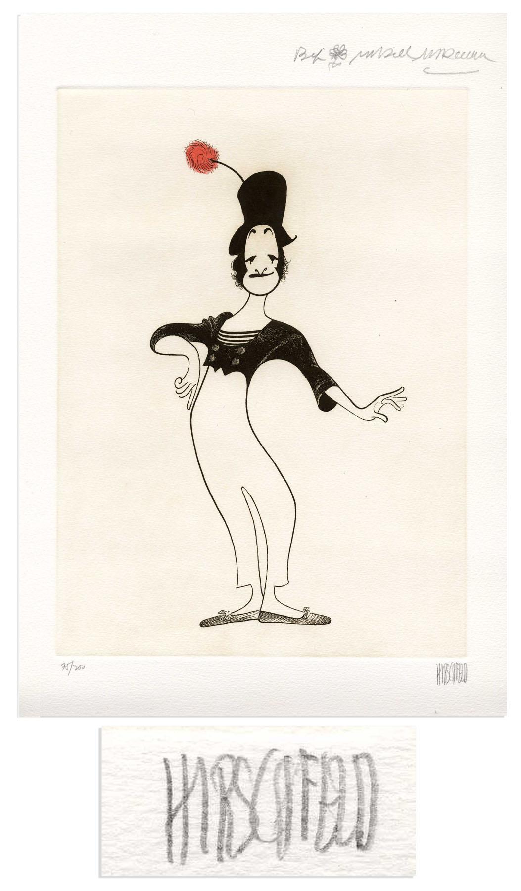 Famed caricaturist Al Hirschfeld signed etching depicting acclaimed French actor and mime, Marcel Marceau. Sketch measures 10'' x 15.5'' and is matted to an overall size of 15'' x 20''. Signed ''Hirschfeld'' in distinctive block lettering and numbered ''75/200'', all in pencil. Fine condition overall.