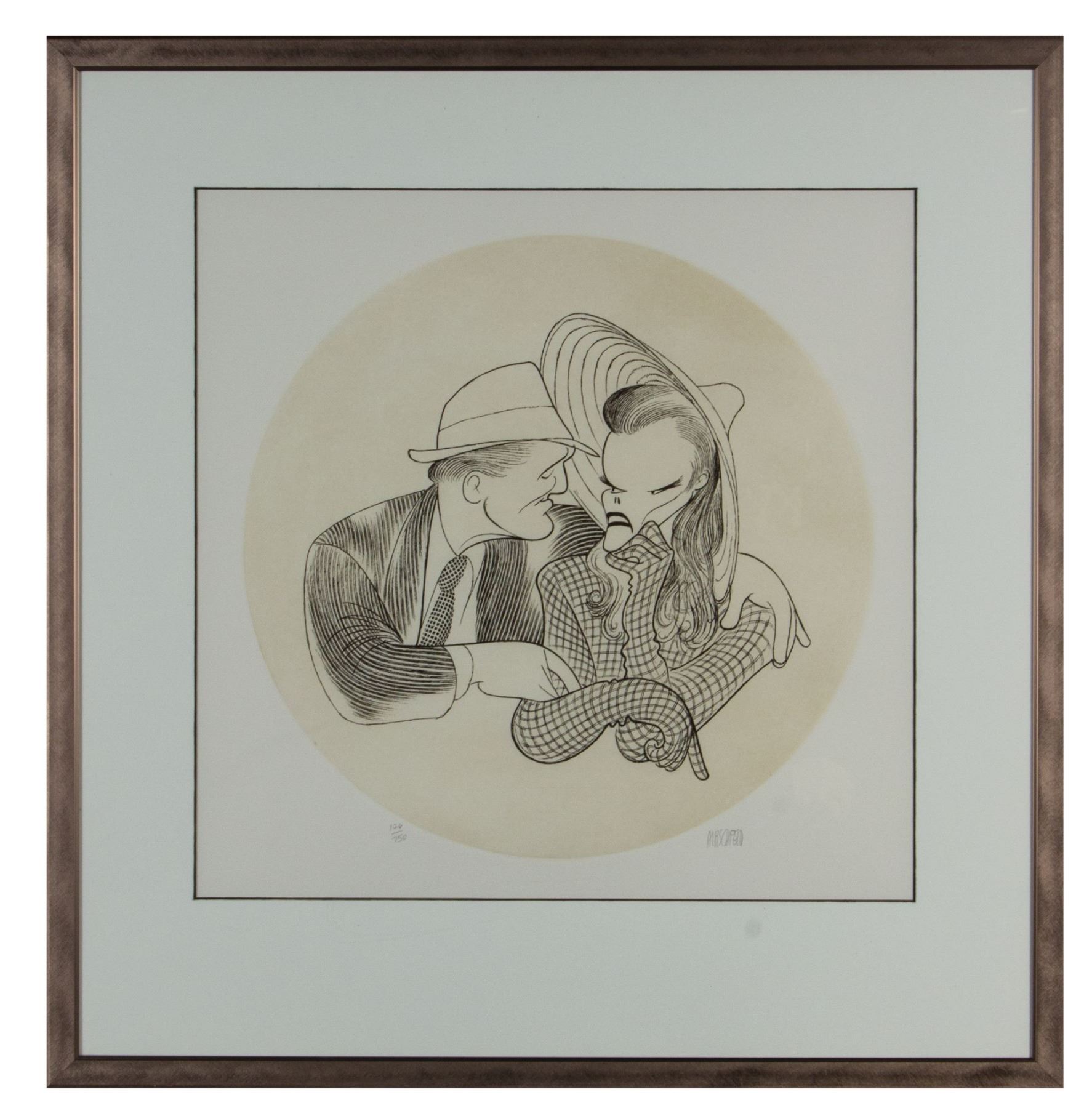 (Hirschfeld, c.1990s) A hand-signed etching by renowned caricaturist Al Hirschfeld. The artwork depicts Katharine Hepburn and Spencer Tracy, two of the biggest stars of the 1940s. It is hand- signed by Hirschfeld and hand-numbered "126/750" in the lower left. The artwork has an image size of 16.75"x16.75" within its 25"x24.25" frame. The artwork is in very fine condition, unexamined out of frame, with some frame wear from previous display, including a thin crack in the glass in the bottom-right corner.