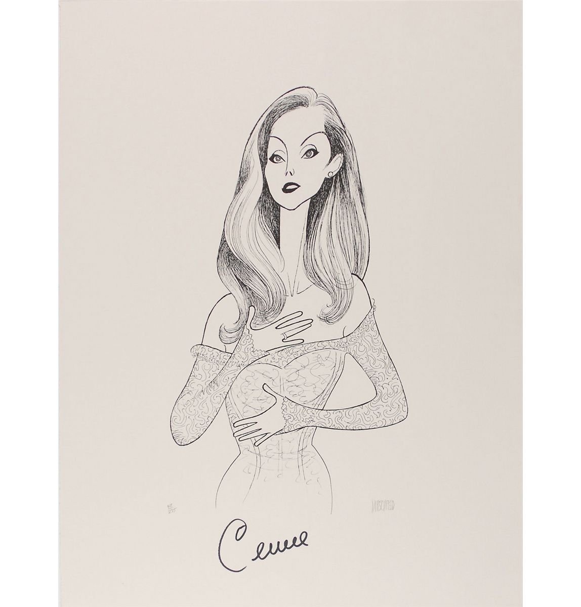 Limited edition 16 x 21 lithograph of Hirschfeld’s caricature of Dion, numbered 48/275, signed in the lower right in pencil by the artist, “Hirschfeld,” and in black felt tip at the bottom by the subject, “Celine.” In fine condition.
