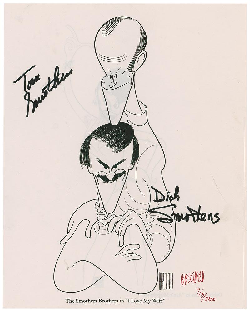 Book page, 8 x 10, bearing a Hirschfeld image of the Smothers Brothers, signed in red felt tip, “Hirschfeld 7/3/2000,” and also signed in black felt tip by Tom and Dick Smothers. In fine condition.