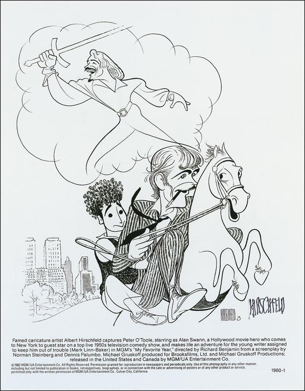 Glossy 8 x 10 MGM promotional photo of a Hirschfeld work for the film My Favorite Year, signed in black felt tip, “Hirschfeld.” In fine condition.