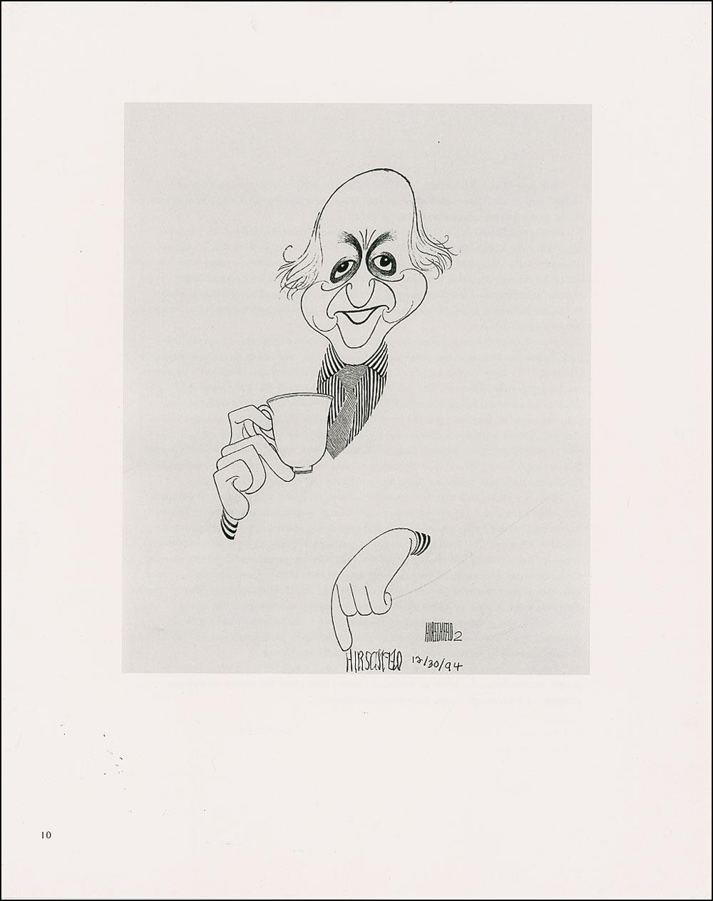 Attractive 9.5 x 12 book page of Hirschfeld’s drawing of photographer Yousuf Karsh, signed in black ink “Hirschfeld 12/30/94.” In fine condition with a few light creases, show-through from printing on the reverse, and a trimmed left edge.