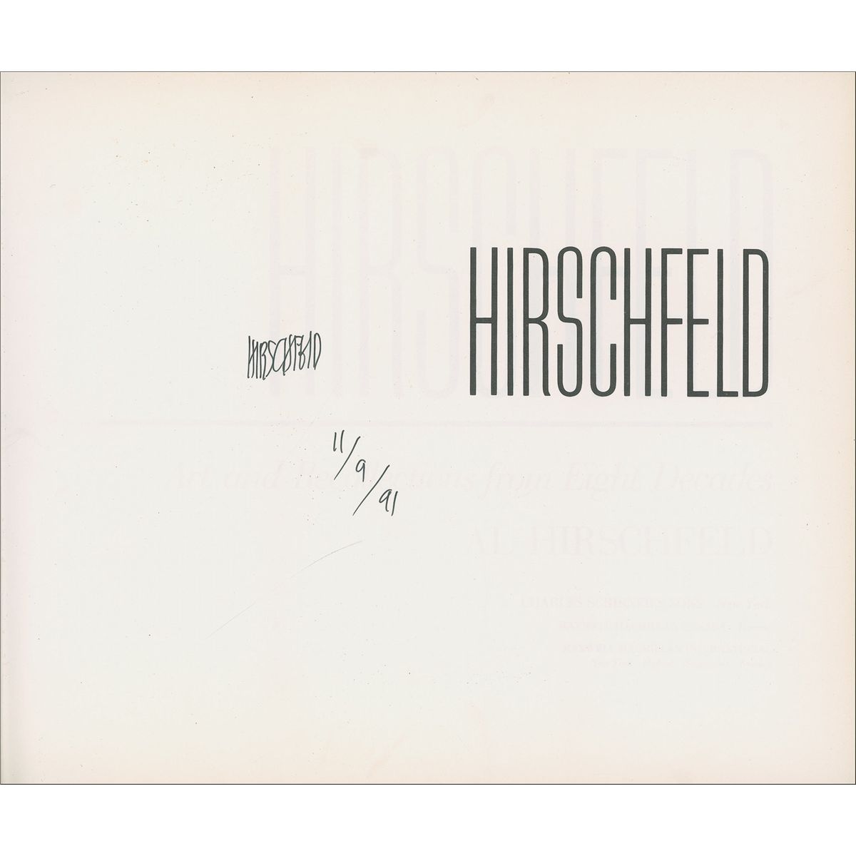 Signed book: Art and Recollections from Eight Decades. First edition. NY: Macmillan Publishing Company, 1991. Hardcover with dustjacket, 12.25 x 10.25, 306 pages. Signed on the half-title page in black felt tip, “Hirschfeld, 11/9/91.” In very good condition, with light toning to the pages, a central vertical fold to the dustjacket, along with mild to moderate toning, creasing, and some scattered surface marks and soiling.