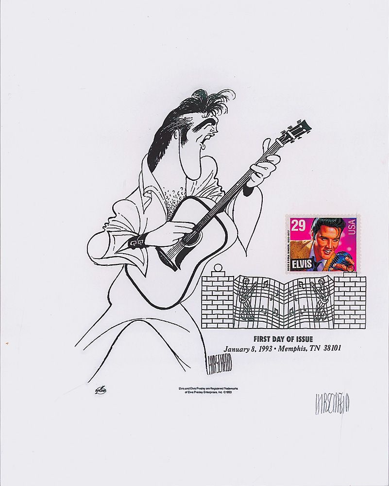 Printed Hirschfeld image of Elvis on an 8 x 10 card bearing an Elvis postage stamp and first-day cancellation, signed in pencil “Hirschfeld.” In fine condition.