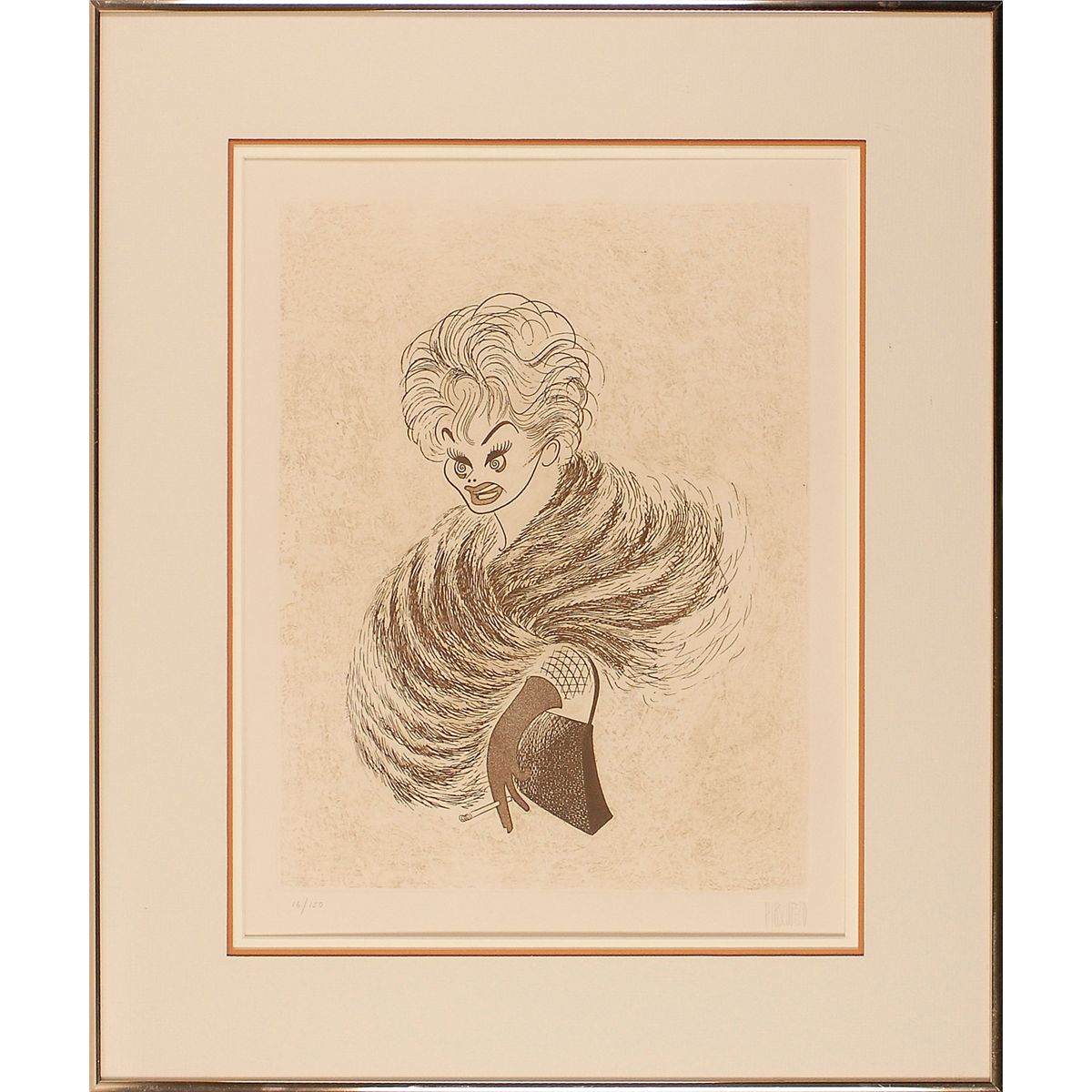 Limited edition 12.75 x 16.25 print of Hirschfeld’s portrait of Lucille Ball, numbered #16/150, signed in pencil in the lower border, “Hirschfeld.” Triple-matted and framed to an overall size of 19.5 x 23. In fine condition.