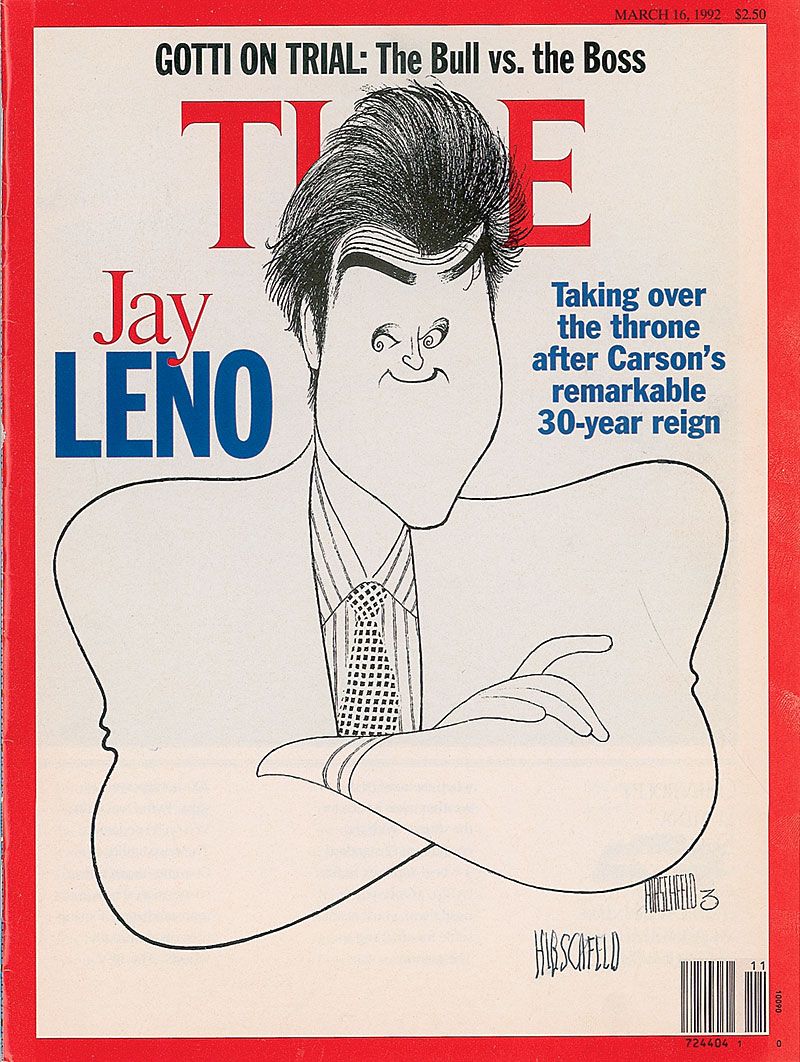 Time magazine featuring Hirschfeld’s caricature of Jay Leno on the cover, March 16, 1992, 8 x 10.75, 74 pages, signed on the cover in black felt tip, “Hirschfeld.” In fine condition.