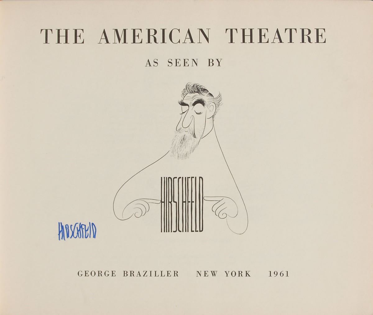 Three items, each signed “Hirschfeld,” including: a pamphlet for Artists in Line: An Al Hirschfeld Retrospective held at the Brandywine River Museum from March 17–May 20, 1990, 4.75 x 8.5, signed on the front cover in blue ink; an Absolut Vodka advertisement removed from a magazine, 8 x 10.75, depicting Hirschfeld drawing their classic bottle, signed in blue felt tip; and a first edition of The American Theatre as Seen by Hirschfeld, hardcover with dust jacket, signed on the title page in blue felt tip. The book is also signed by a wide variety of theatrical performers. In overall fine condition.