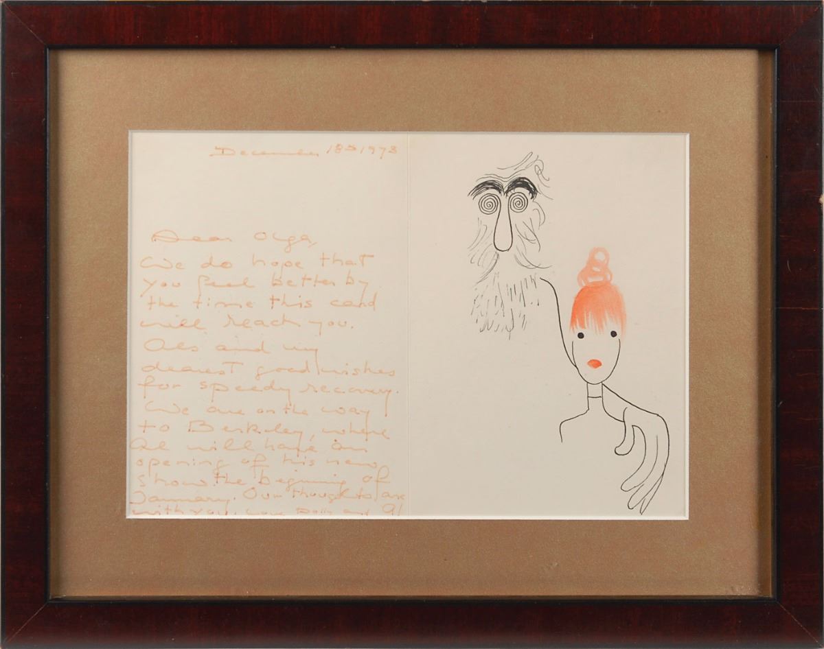 Off-white 8.75 x 6 sheet bearing an original ink and watercolor sketch of Hirschfeld and his petite wife and, on the adjacent side, a handwritten letter from Hirschfeld’s wife, Dolly Haas, signed “Dolly and Al,” dated December 18, 1973, in full: “We do hope that you feel better by the time this card will reach you. Al’s and my dearest good wishes for speedy recovery. We are on the way to Berkeley, where Al will have an opening of his new show the beginning of January. Our thoughts are with you.” Matted and framed. In fine condition.