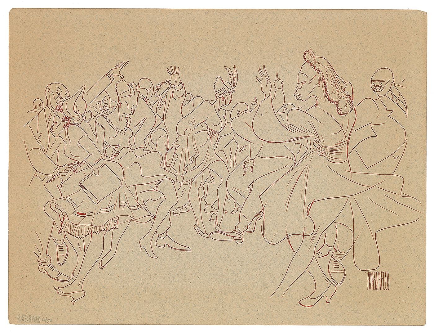 Limited edition color 12.25 x 9.25 print entitled 'Stompin' at the Savoy,' numbered 6/50, depicting numerous dancers at Harlem's Savoy Ballroom, signed in the lower left corner in pencil, "Hirschfeld." In fine condition.