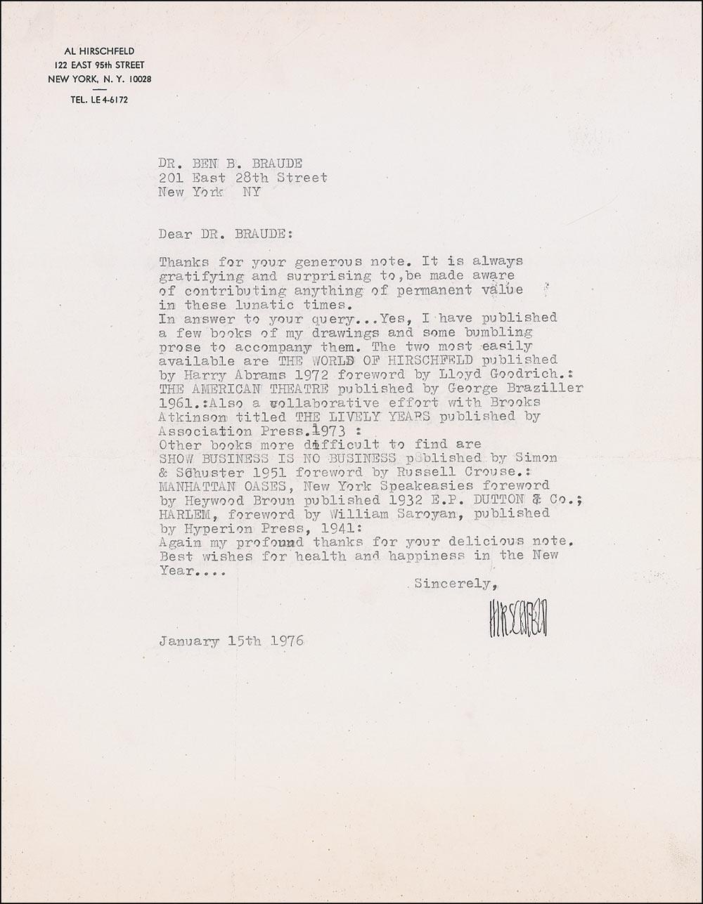 TLS signed “Hirschfeld,” one page, 8.5 x 11, personal letterhead, January 15, 1976. Letter of gratitude to an admirer. In part: “It is always gratifying and surprising to be made aware of contributing anything of permanent value in these lunatic times. In answer to your query…Yes, I have published a few books of my drawings and some bumbling prose to accompany them.” In fine condition, with intersecting folds, one right next to beginning of signature, and a bit of mild toning to edges. Accompanied by the original mailing envelope.