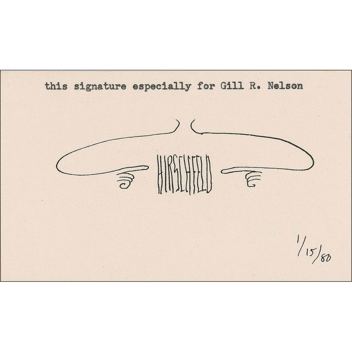 Felt tip line drawing of fingers pointing to his signature, “Hirschfeld,” and date of “1/15/80” on a white 5 x 3 card. In fine condition.