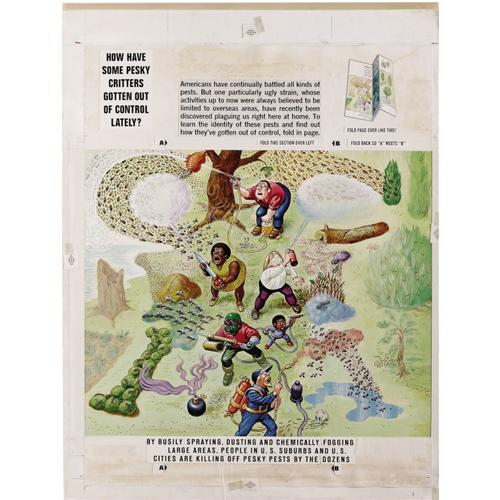 <B>Al Jaffee - Mad #183 Fold-In Back Cover Original Art (EC, 1976).</B></I> Al Jaffee's fold-in asks "How have some pesky critters gotten out of hand lately?" Snappy fold-in answer sez: "By bugging U.S. citizens." This fold-in scene has an image area of 17" x 21", and the art is in Excellent condition. Also included are two production overlays -- one with an amberlith screen and one with type instructions. <I>From the Mad Magazine Archives.</B></I>